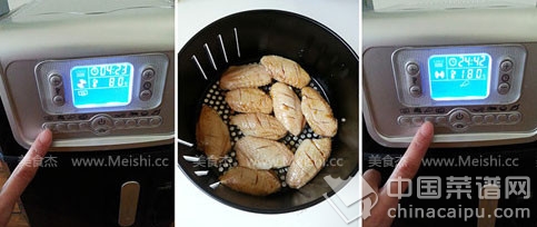 3.首先打开空炸锅点预热键预热3-5分钟,将腌好的鸡翅排入炸篮中,按下鸡肉按键,制做时间为25分钟