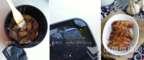 4.15分钟左右取出炸篮,翻面刷料,撒入蒜末,继续炸制5分钟既可。可以看到制做中不仅没有使用一滴油,空炸锅还将食物本身多余油脂沥出,装盘既可