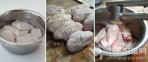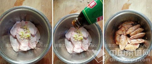 1.鸡翅清洗干净,泡去血水,充分沥干水份,两面用刀划开,蒜压成蓉加入鸡翅中