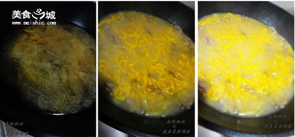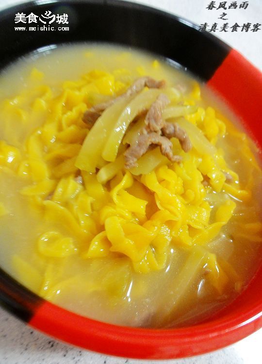 10、放入榨菜丝继续炒匀,加入清水1200克、生抽1汤匙。大火烧开。