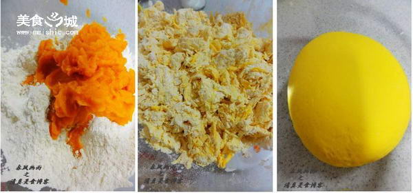 4、将蒸好的南瓜用勺子碾成泥,过筛加入面粉中。