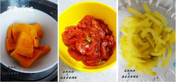 3、将榨菜去皮、去根蒂洗净,切成与牛柳一样的细丝。