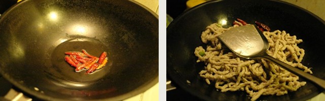 1.锅中放入色拉油小火烧热,放入干红辣椒炒香后,放入洗干净的面筋丝,大火翻炒,加入盐和生抽调味。
