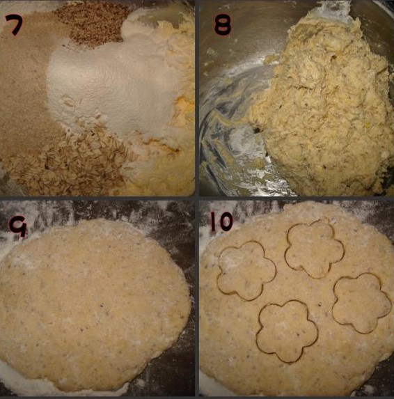 原料:软化的黄油120g,牛奶90毫升(温的),鸡蛋一个(室温),糖60g(我刚好剩下30g糖粉,就用上了),中粉140g+玉米淀粉60g,全麦粉50g,芝麻50g,燕麦片50g,泡打粉3g。