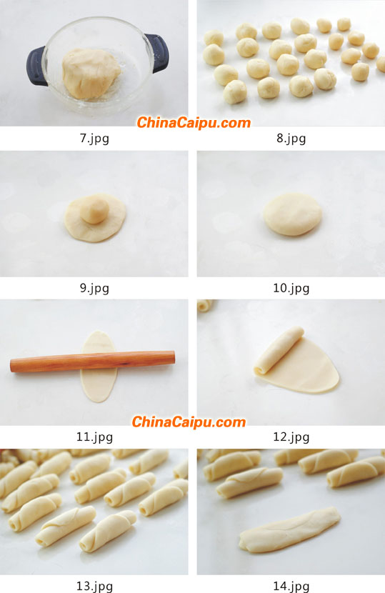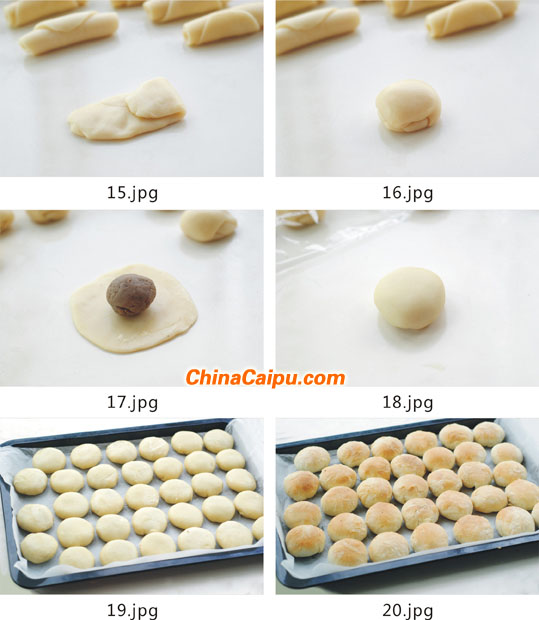 8、将油皮、油酥分别分成20g及14g的小份,滚圆。
