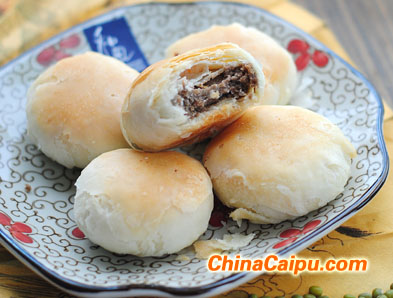 17、将面团擀成中间略厚四周薄的圆片,放上炒好的绿豆馅。