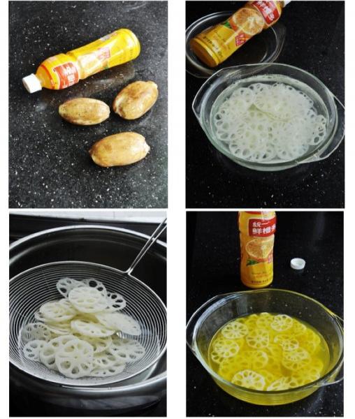 橙汁藕片 原料:嫩藕,统一鲜橙多(橙汁品牌可自己定),盐,冰矿泉水 橙汁藕片做法 1、准备好原料。 2、嫩藕去皮洗净,切成0.2厘米厚的薄片,为防止藕片变黑,把薄藕片浸入淡盐水里片刻。 3、藕片入沸水中焯至沸水再次沸腾,立刻把藕片捞起,浸入冰矿泉水中10分钟(这一步骤可使藕片咬起来更加爽口)。 4、容器里倒入统一鲜橙汁多,放少许盐以降低橙汁的甜度不至于腻,把藕片放进橙汁里浸泡一夜。