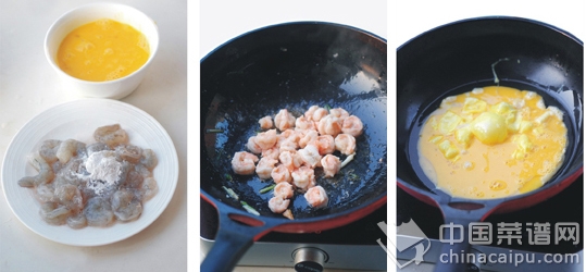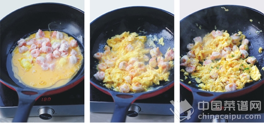 “滑炒”——热锅倒入油,中火烧至四成热,倒入虾仁迅速划散,看到虾仁色泽变红即可出锅。