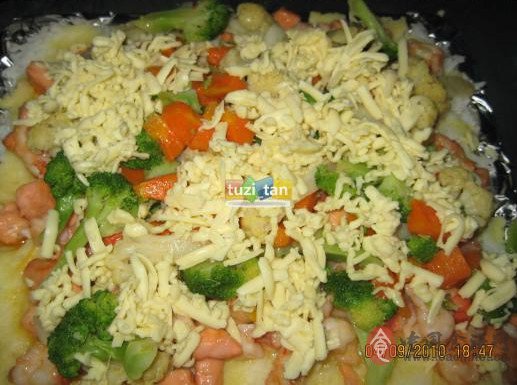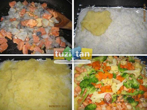 主要食材:鲑鱼、虾仁、花菜、花椰菜、红萝卜、马铃薯泥做法:1.先把虾仁和鲑鱼切丁,加点酒、胡椒粉、盐调味,在撒上些玉米粉拌匀,起锅放黄油把鲑鱼和虾仁炒至八分熟出锅。再把青菜先烫熟后再起锅炒香,加点盐调味。2.家里没有大的烤盘,我就用烤箱的烤盘铺上锡纸,铺上米饭,在抹上薯泥,再把鲑鱼虾仁、青菜放在最上面3.最后撒上起司,入烤箱。青菜上面有起司,对付像我家儿子这种不爱吃青菜的是个好办法哦。