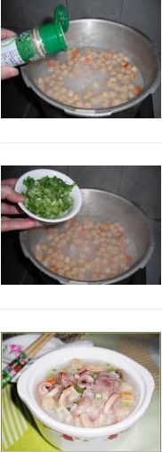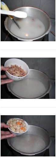 11. 开火,把粥煮开,然后把爆香过的鱿鱼放进去煮。(不可煮太久,以免鱿鱼煮老了变硬,影响口感)