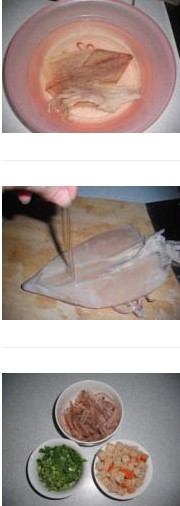 2. 从泡发好的鱿鱼上面取出软骨,如图所示;接着把鱿鱼洗净。(干鱿鱼没泡发前不好取出)