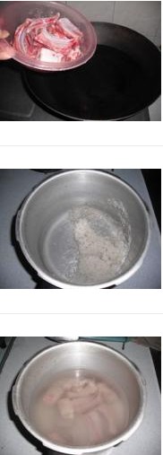 4. 排骨洗净,放到煮开的水了焯一下,沥干捞出。