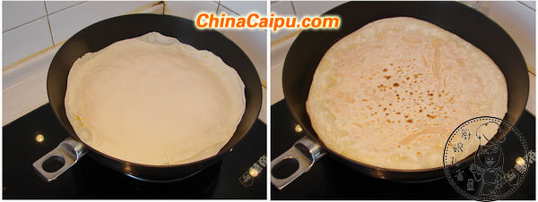 6、锅要热透,转中火,不用油,把饼放入,手要转动饼,使之受热均匀