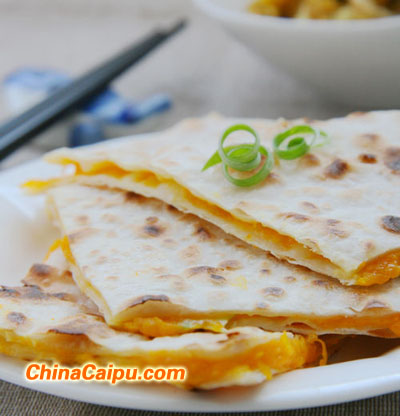 5、取其中一张面饼,把南瓜丝均匀的涂抹在面皮上,然后另一张盖在上面,四周压实