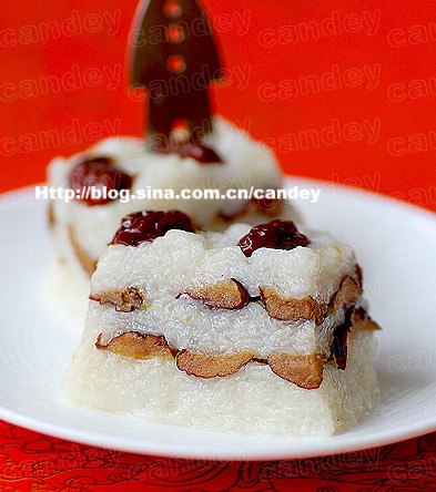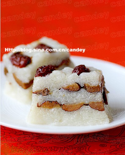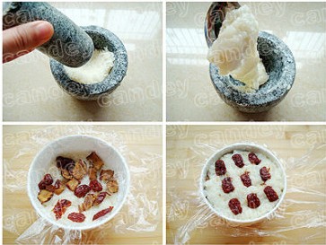 5. 取一个碗,碗壁铺上保鲜膜,依次铺一层米糕,一层红枣片,再一层米糕...直至铺完所有材料.