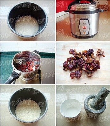 1. 糯米清洗干净,放入电压锅内胆,加入适量水(比白米饭的水量稍微少一些)和适量冰糖,浸泡四小时后,选择"煮饭"键煮熟.(有预约功能的电压锅可以定时4小时)