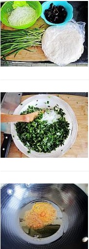 2. 韭菜洗净切碎,再把粉丝,木耳切碎放入盆中。