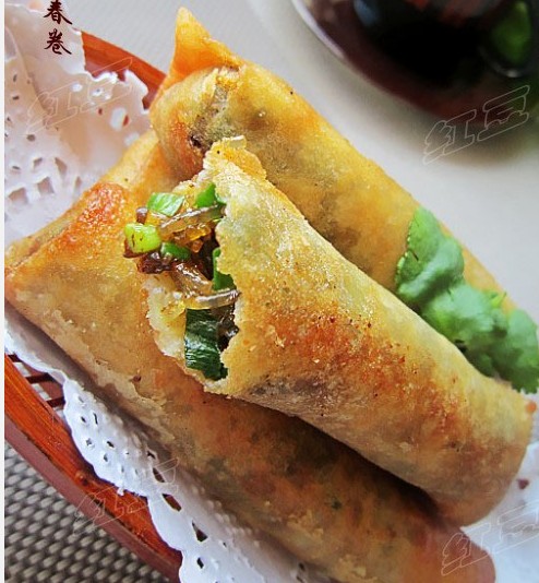 10. 锅中油烧热放入春卷炸制金黄焦酥即好。