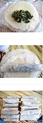 8. 轻轻卷起,封口用面糊粘紧,成为春卷生坯。