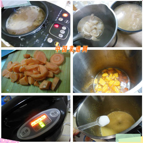 16、切好的胡萝卜和南瓜丁一起放入豆浆机里,不要超过最高水位线。
