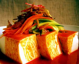 5、将豆腐摆入盘内,放上腌好的红萝卜丝和黄瓜丝及炒好的银鱼丝,顶部撒上几缕红椒丝做点缀,最后浇上香蒜辣酱汁,即可食用。