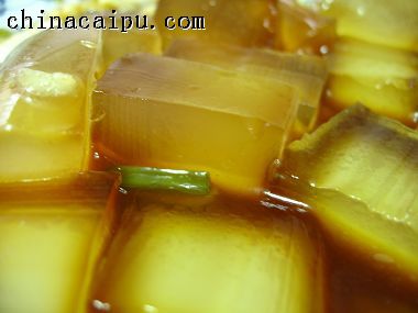 7、各种冻冻切块(切皮冻时晃着切,这样皮冻上有纹路,筷子好挟一点,不过我吃的时候就直接用的调羹,筷子实在不好挟)加点酱油,醋,麻油,蒜泥,味精,喜欢辣的再搁点辣椒红油什么的