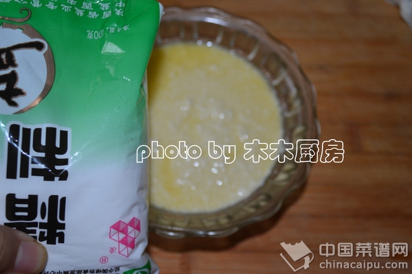 4.加入芡粉,搅打鸡蛋液至表面气泡增多