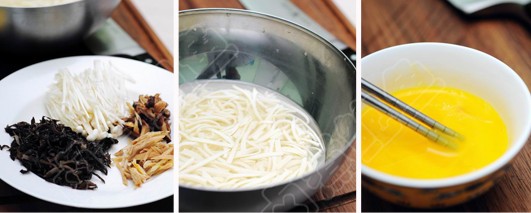 1) 将干木耳,香菇,黄花菜,金针菇泡发后洗净,切成丝。金针菇洗净劈开备用
