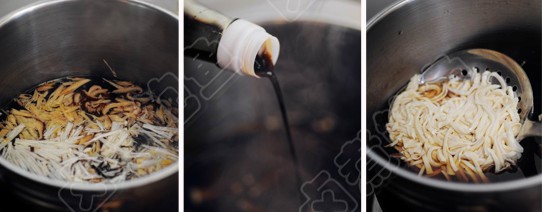 4) 锅中倒入清水,大火煮开后转中火,将金针菇,木耳,黄花,香菇丝放入锅中煮制5分钟