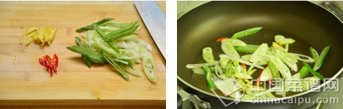 2.姜、辣椒切碎,大葱斜切成条;依次将姜、辣椒、大葱放油锅爆香