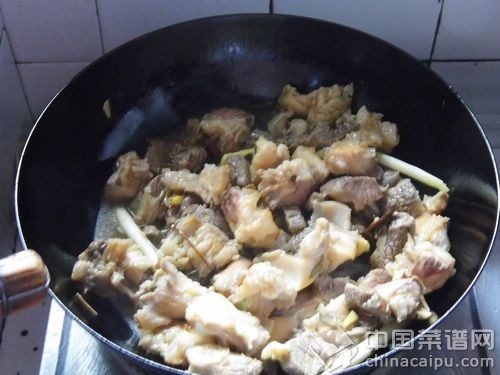 7.倒入牛肉翻炒,加入2勺生抽和1勺白酒翻炒均匀后,倒入足量开水烧开撇去浮沫(切记一定是开水)