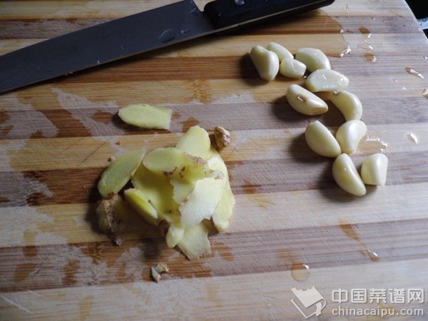 3.生姜一块切成大片,大蒜2头剥皮备用