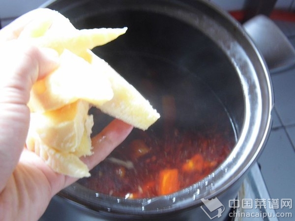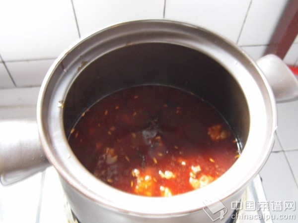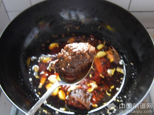 6.然后开中火放入3勺郫县豆瓣酱,2勺东北大酱爆香出红油