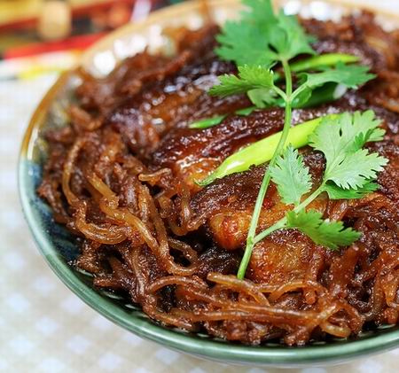 3、炒好的五花肉放入盆中,加粉条,葱段,盐,味精,五香粉,辣椒酱,甜面酱拌匀