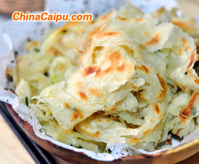 16、用锅铲从饼胚的边缘往里推,推成松散状,如果想更香更酥,又有足够的鸡油,再撒入适量鸡油,略煎片刻,即可。