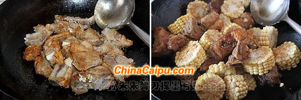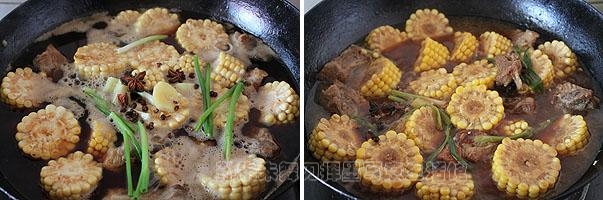 7、放入葱段、姜片、花椒、八角、料酒和老抽也炒均匀,然后放入热水没过排骨和玉米;