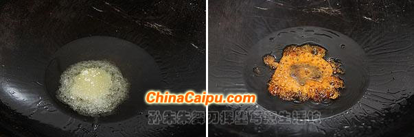 4、转小火,将白糖或冰糖熬成糖色;