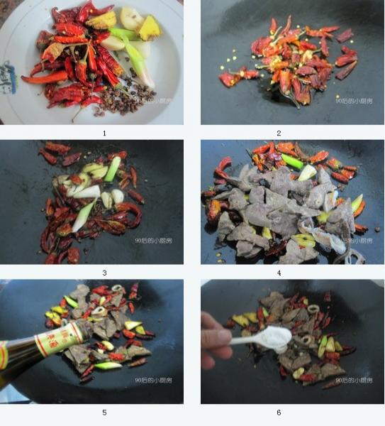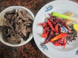 原料:处理好的猪肺适量、小的干辣椒、大的干辣椒、青蒜段、生姜、花椒