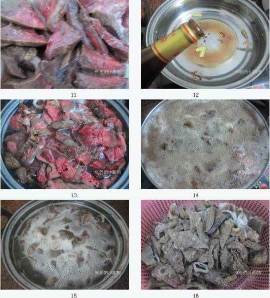 3、第三步中猪肺要冷水下锅,慢慢随着水温的升高将猪肺里剩余的脏东西煮出,开锅后煮一会儿就可以马上过清水捞出了,这样才能保证猪肺的口感。加入花椒生姜料酒可以去腥。