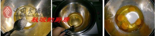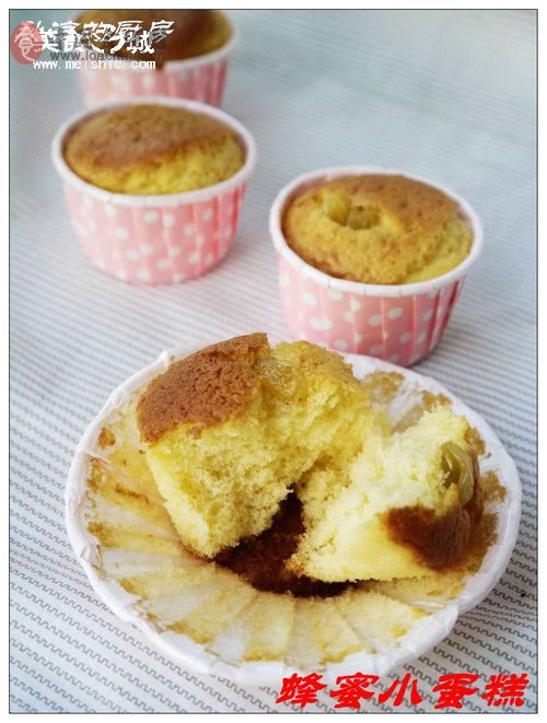 材料:玉米油40克,蜂蜜60克,全蛋4个,细砂糖40克,低粉100克,泡打粉1/2小匙