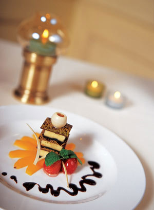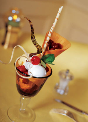 原料:柠檬冰棍1只,香草冰淇淋1只,草莓冰淇淋1只,白巧克力棒1只,可可粉10克,清凉薄荷5克,鲜奶油5克