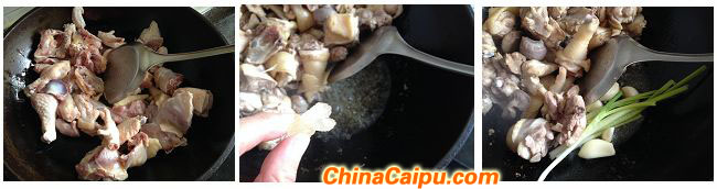 2、热锅凉油,下鸡块翻炒,待鸡肉紧实出油后,将鸡拨至一边,下冰糖、葱、姜、蒜炒至冰糖溶化。