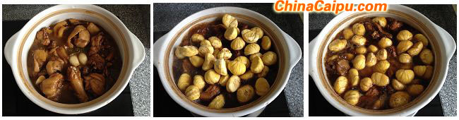 5、大火烧开后转小火焖约40分钟,打开加入板栗,烧开后转小火继续焖约40分钟至板栗酥烂即可。
