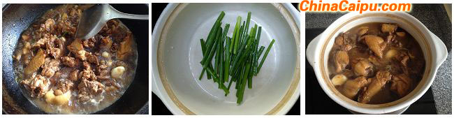 4、加开水至没过鸡块的三分之二处,加适量盐调味,另取砂煲,将葱叶垫底,倒入烧开的鸡块和汤。