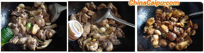 3、将鸡块炒匀,烹入适量料酒,加生抽、老抽炒匀上色。