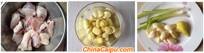1、新鲜土鸡洗净斩大块,板栗去壳去皮用清水浸泡,姜大块、蒜整粒拍破,葱白整段。