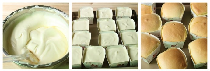 5. 用勺子将面糊小心填入方形戚风纸杯中,约8分满为宜(太满容易大开裂,爆头)