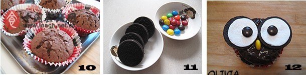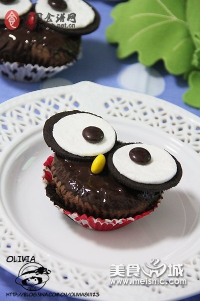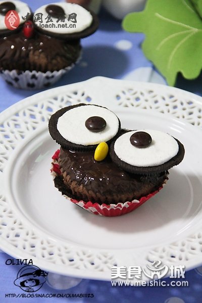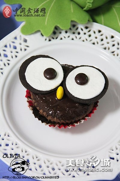 11、猫头鹰杯子蛋糕做法:黑巧克力适量隔水溶化,奥利奥饼干一分为二、M豆适量。