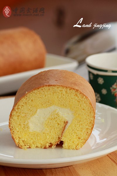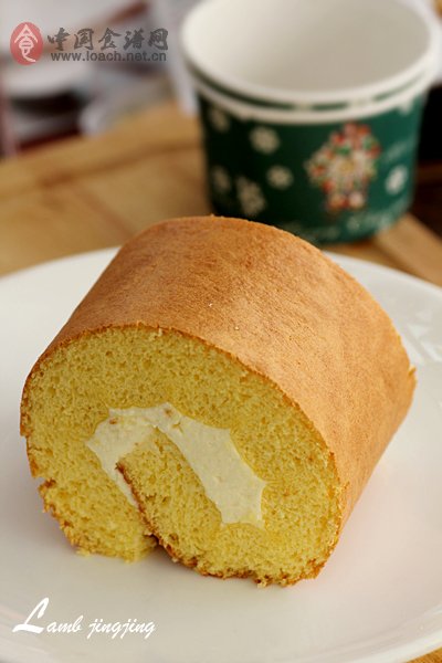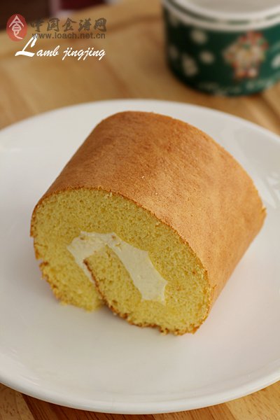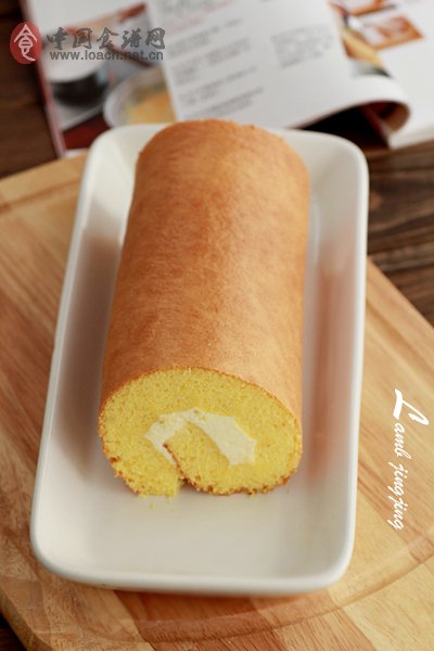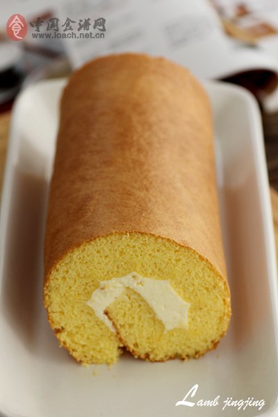 13、蛋糕放凉后,取一块新的油纸,将蛋糕翻过来,涂上一层淡奶油,借助擀面杖将其卷起即可。