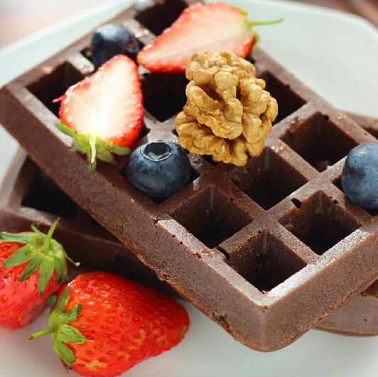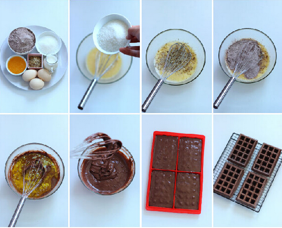 1.准备原料 a低筋面粉、可可粉、泡打粉混合过筛 b核桃切碎 c黄油融化